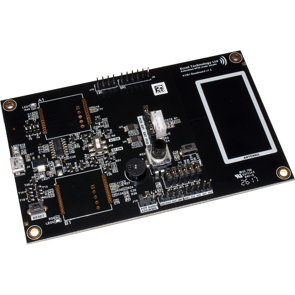 B1 modules. The User can test all features of both modules, check tag detection ranges, or install the Baseboard on their own systems to verify compatibility. The Baseboard is a complete reader and tag acceptance solution for passive RF transponders. The modules are designed with embedded applications in mind. These products are an ideal design choice if the user wishes to add RFID capability to their design quickly and without requiring extensive RFID and embedded software expertise and time. The on board low power ARM microcontroller handles the RFID configuration setup and provides the User with a powerful yet simple command interface to facilitate fast and easy read/write access to the memory and features of the various transponders supported by these modules. The modules simply require a single power and GND connection from the user PCB as well as two connections to an antenna. Eccel Technology Ltd (IB Technology) provide a wide range of suitable antennas designed to be used with these modules. The A1-B1 Baseboard provides these connections to the modules for the user to evaluate and develop their application on either the RFID-A1 or RFID-B1 module.