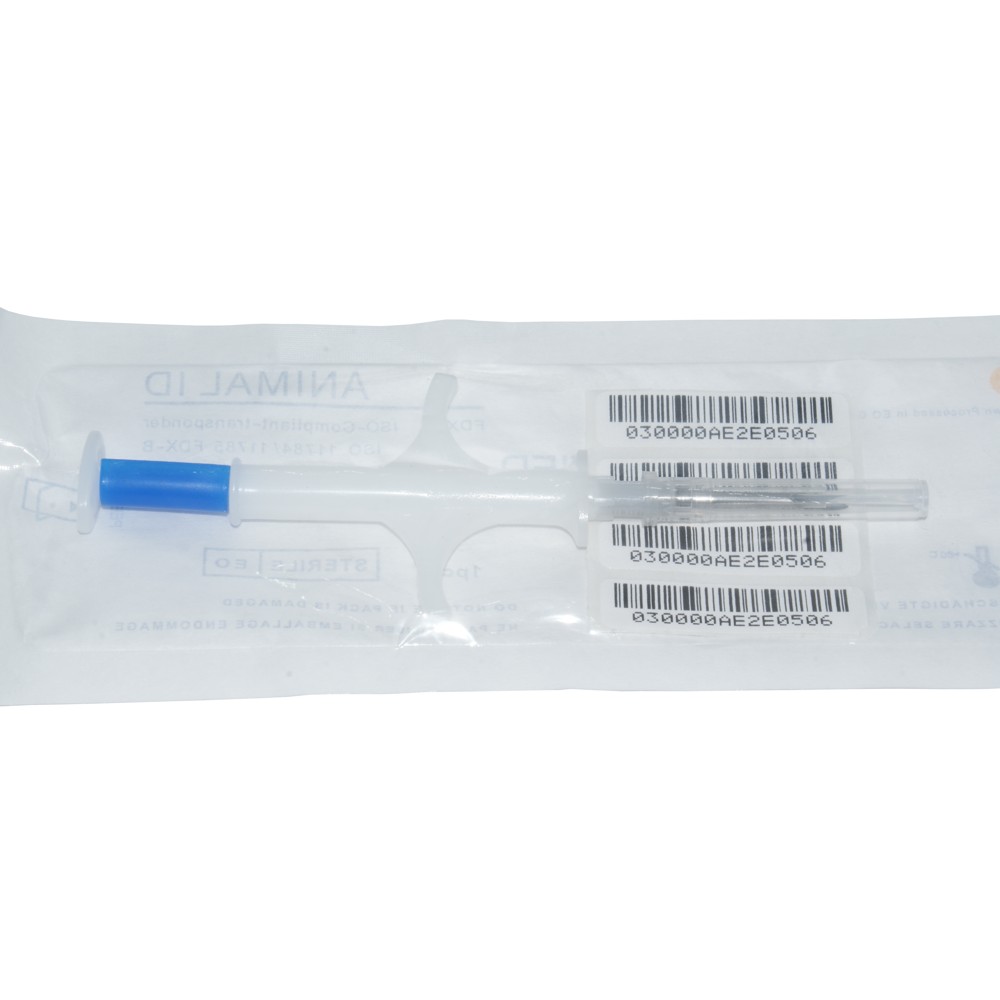 EM4102 tag in disposable single use syringe. IP68 rated for injection into animals/ birds. Size: 12 x 2.12mm.