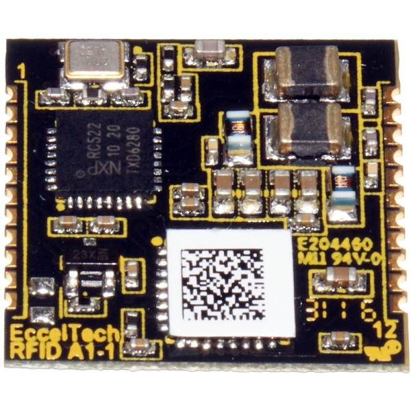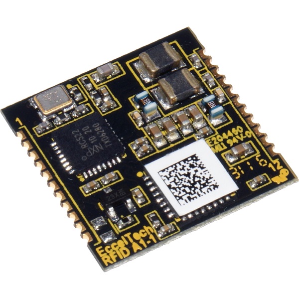 - Small footprint. This enables the RFID A1 module to be placed on the user’s circuit board just like any other surface mount component. The package is just over 20mm x 20mm in size, with castellated edges to enable easy surface mount soldering of the module to the user’s printed circuit board.